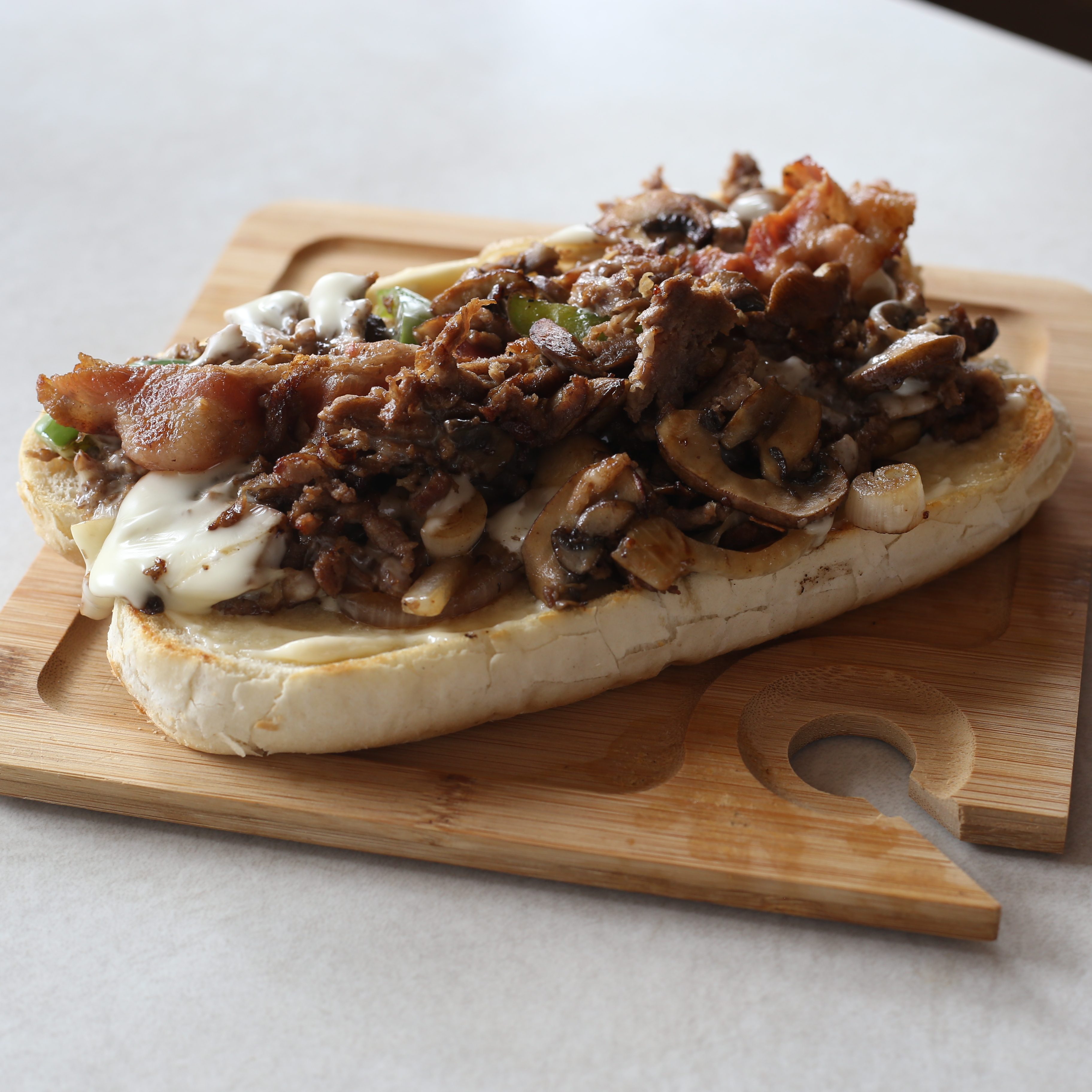 Try our thinly cut steak with perfectly melty swiss cheese loaded with bacon, mushrooms, bell pepper, and onion!
